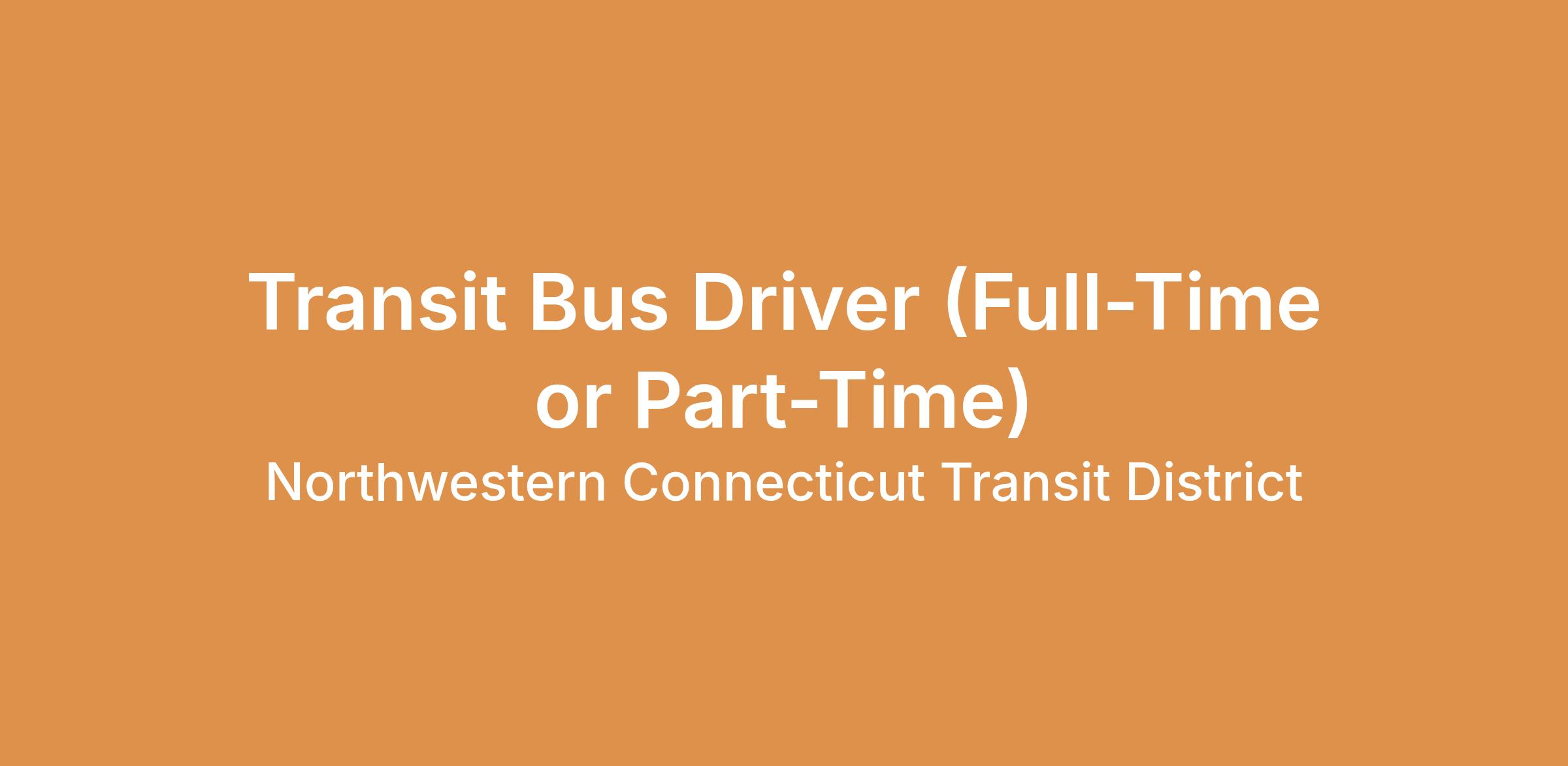 Northwest Connecticut Transit District is an equal opportunity employer and administers all personnel practices without regard to race, color, creed, religion, national origin, sex (including gender identity, sexual orientation, and pregnancy), age, family medical information or genetic information, disability, military service, or other protected class.